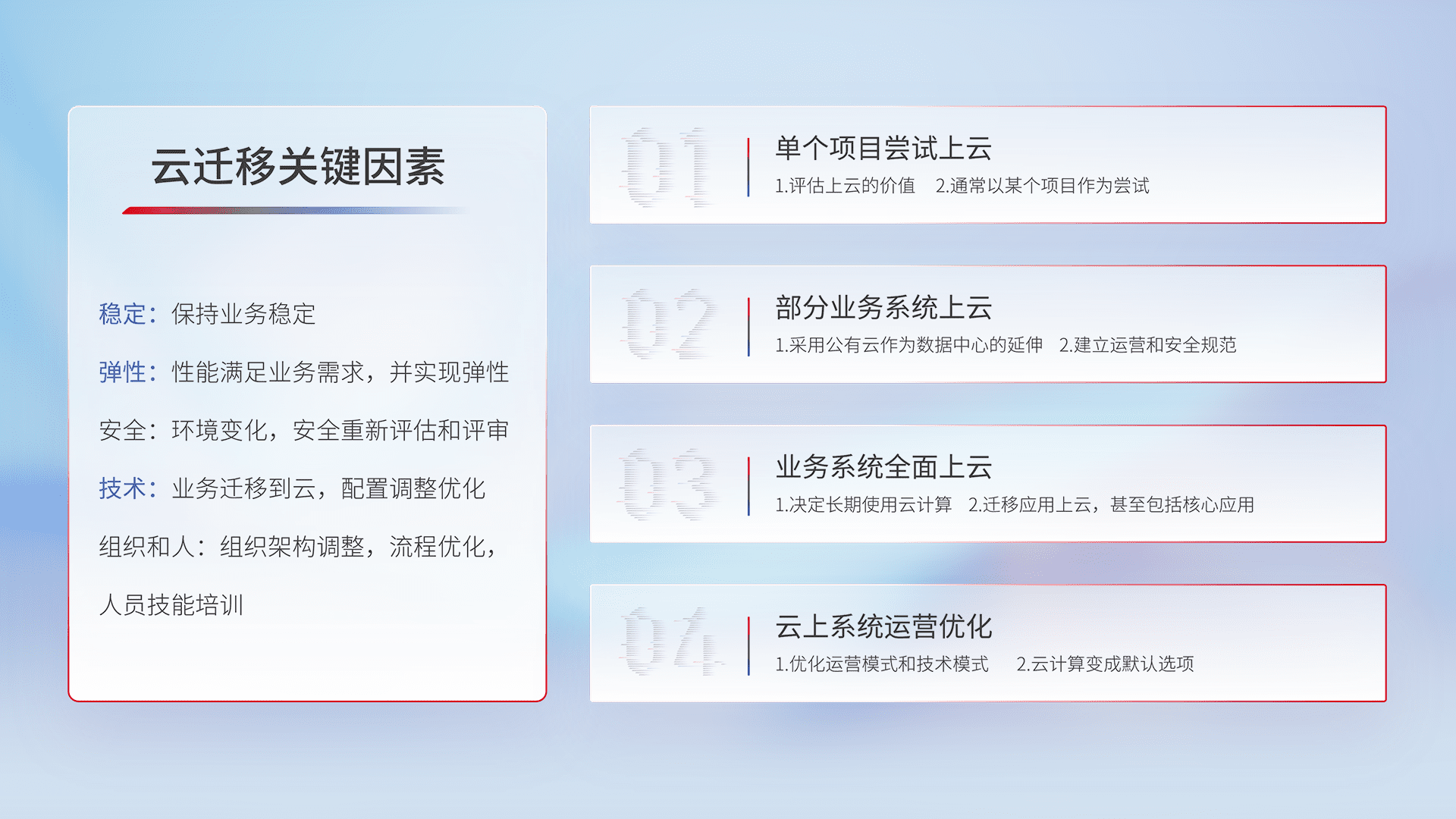 结合实际业务,,,从规划设计、、、云平台选型、、、云原生改造、、、数据迁移、、、、集成交付,,,迁移全过程为客户识别最佳上云路径,,,,做好风险识别管理,,,,设计网络架构、、身份权限、、、、安全审计合规、、、操作审计、、、、日志审计、、、、监控告警策略、、多站点容灾设计等,,,,对云上基础设施进行整体规划,,,,提升IT治理水平,,,以满足弹性、、、高可用、、高性能的需求。。