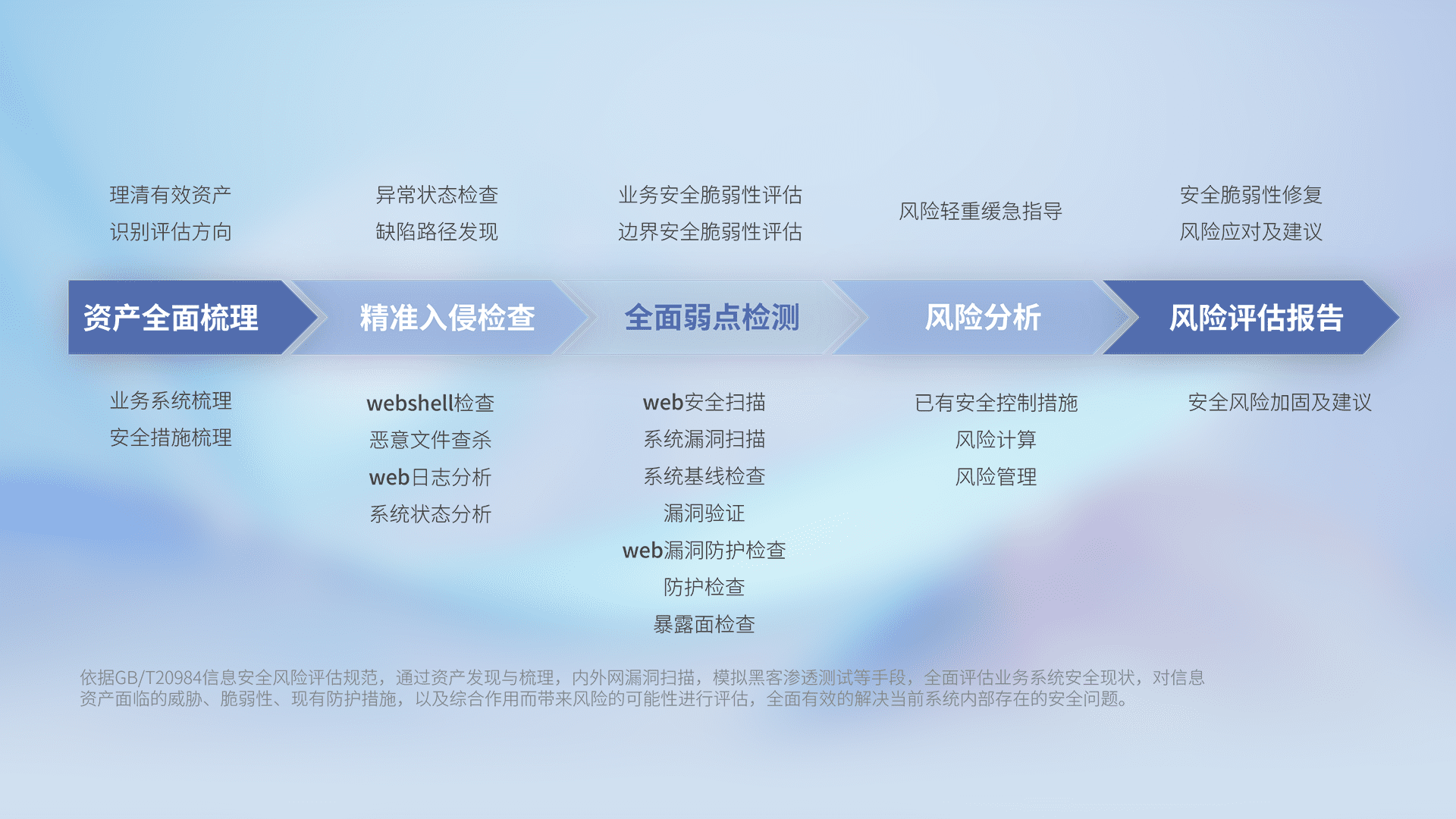 针对客户行业特性,,以专业的安全服务+多厂商联合解决方案提供专属的一站式安全管理服务,,,,帮助客户全面感知网络空间威胁,,基于识别、、、、检测、、分析、、防护、、监测、、、、响应的服务理论模型,,从方案咨询、、集成交付、、评估验证、、、优化加固、、、、运维运营,,,,致力于为客户提供完整的闭环管理式安全服务。。以实战经验为客户打造高抵御风险的安全体系,,帮助客户发现威胁、、、对抗威胁、、处置威胁,,不断积累安全对抗能力,,,,持续保障数字化安全。。。。
